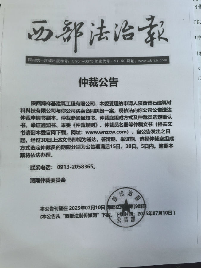 陜西普石建筑材料科技有限公司與陜西鴻祥基建筑工程有限公司買(mǎi)賣(mài)合同糾紛案公告